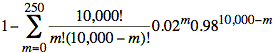 P(m > 250, n = 10,000) = 1 − P(m ≤ 250, n = 10,000)