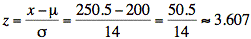 Here, we are interested in x = 250 phone calls, and we want to compute the area under the gaussian to the right of x. Since x only has integer values, however, we actually get a slightly better estimate if we use x = 250.5.
