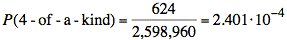 # 4-of-a-kinds = 13C1⋅4C4⋅48C1 = 13⋅1⋅48 = 624