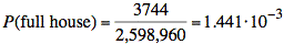 # full houses = 13C1⋅4C3⋅12C1⋅4C2 = 13⋅4⋅12⋅6 = 3744