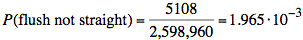# flushes (not straight) = 4C1⋅(13C5 − 10) = 4⋅1277 = 5108