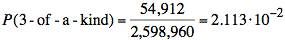 # 3-of-a-kind = 13C1⋅4C3⋅12C2⋅4C1⋅4C1 = 13⋅4⋅66⋅4⋅4 = 54,912