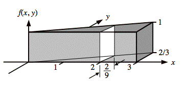 The conditional probability, f(y | x = 2), is equal to the cross-section of f(x, y) in the y direction at x = 2 scaled vertically to make the area equal to one. The illustration below shows the cross-section at x = 2.