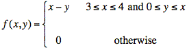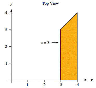 Sol'n: The region, 3 ≤ y ≤ 4 and 0 ≤ y ≤ x, on which f(x, y) ≠ 0 is the support of f(x, y). It is a trapezoid, as shown below. The diagram also shows the vertical segment for x = 3.
