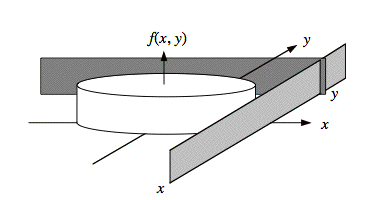 F(x, y) equals the volume of f(x, y) to the left of x and in front of, (i.e., less than), y. The illustration, above, shows two walls at x and y. F(x, y) = 1 for the x and y shown, since all the volume of f(x, y) is left of x and in front of y. The region of the where F(x, y) = 1 becomes apparent in a top view: