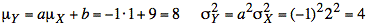 Ex: If X has a gaussian (i.e., normal) distribution with mean μX = 1 and standard deviation σX = 2, i.e., X~n(1, 2), find the probability density function for Y = −X + 9.