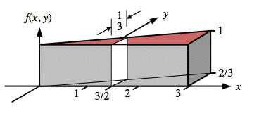 The value of fX(x) at a given value of x is the area of the cross section of f(x, y) in the y direction. In the illustration below, the value of fX(x = 3/2) is shown to be equal to 1/3 ⋅ 1 (i.e., width ⋅ height) = 1/3.