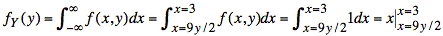 Similar arguments apply for the calculation of fY(y). The graphical approach relies on calculation of areas of cross sections in the x direction. In contrast to cross sections in the y direction, the area of the cross sections in the x direction decrease in area as y increases. The diagram below shows that the cross section for y = 1/3 has area equal to 3/2 ⋅ 1 (i.e., width ⋅ height) = 3/2.