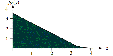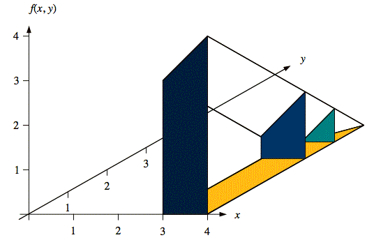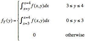 Sol'n: The region, 3 ≤ y ≤ 4 and 0 ≤ y ≤ x, on which f(x, y) ≠ 0 is the support of f(x, y). It is a trapezoid, as shown below. The diagram also shows several horizontal segments over which f(x, y) ≠ 0 as a function of position y.