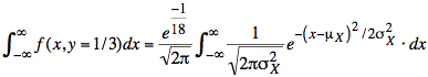 We compute the integral in the denominator by factoring out the integral of a gaussian distribution whose value must be equal to one. Our first step in this process is to substitute numerical values for ρ and y.
